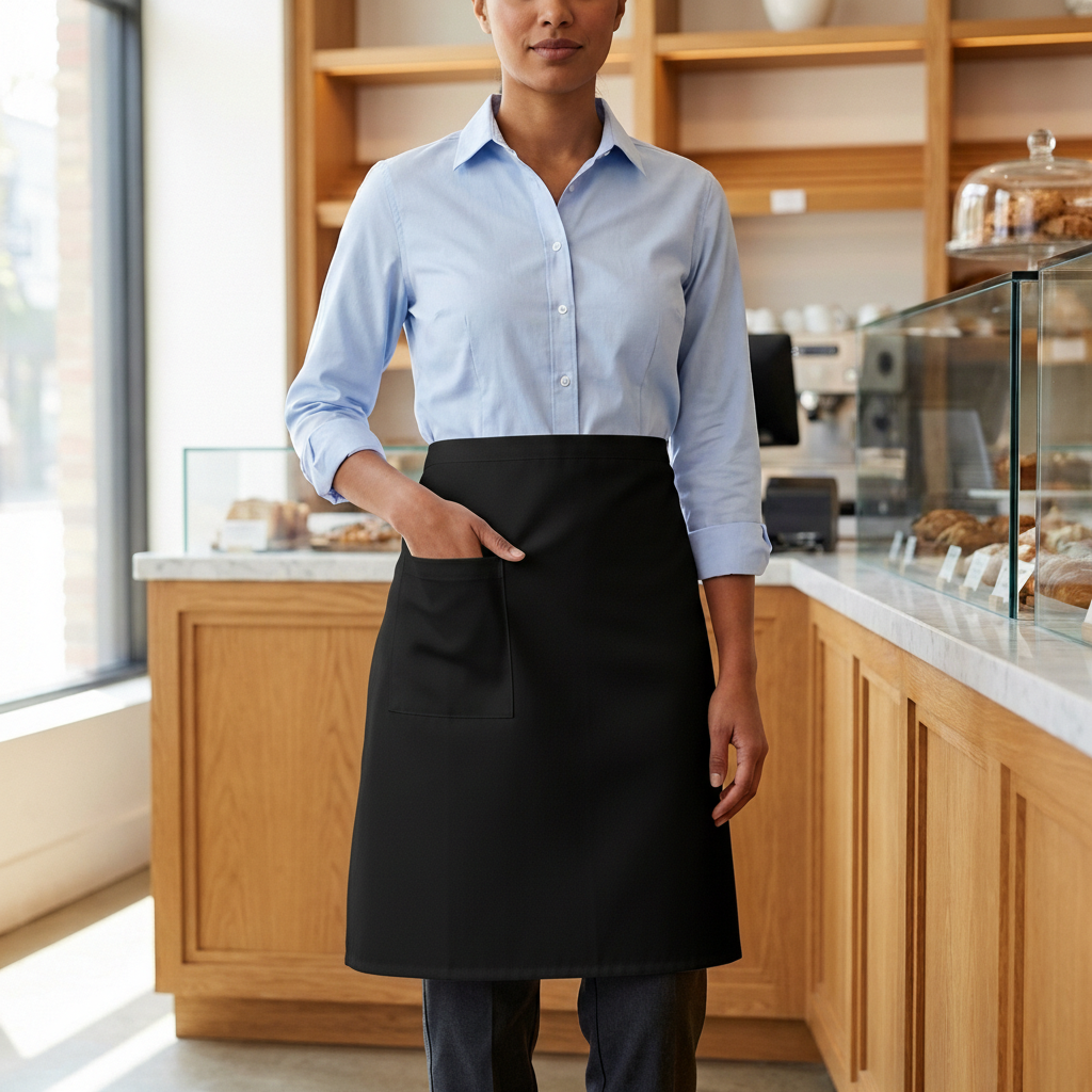 Siyah & beyaz belden önlük, hem şık hem de işlevsel tasarımıyla işletmenizin kurumsal görünümünü güçlendirirken, personelinize konforlu bir çalışma deneyimi sunar.